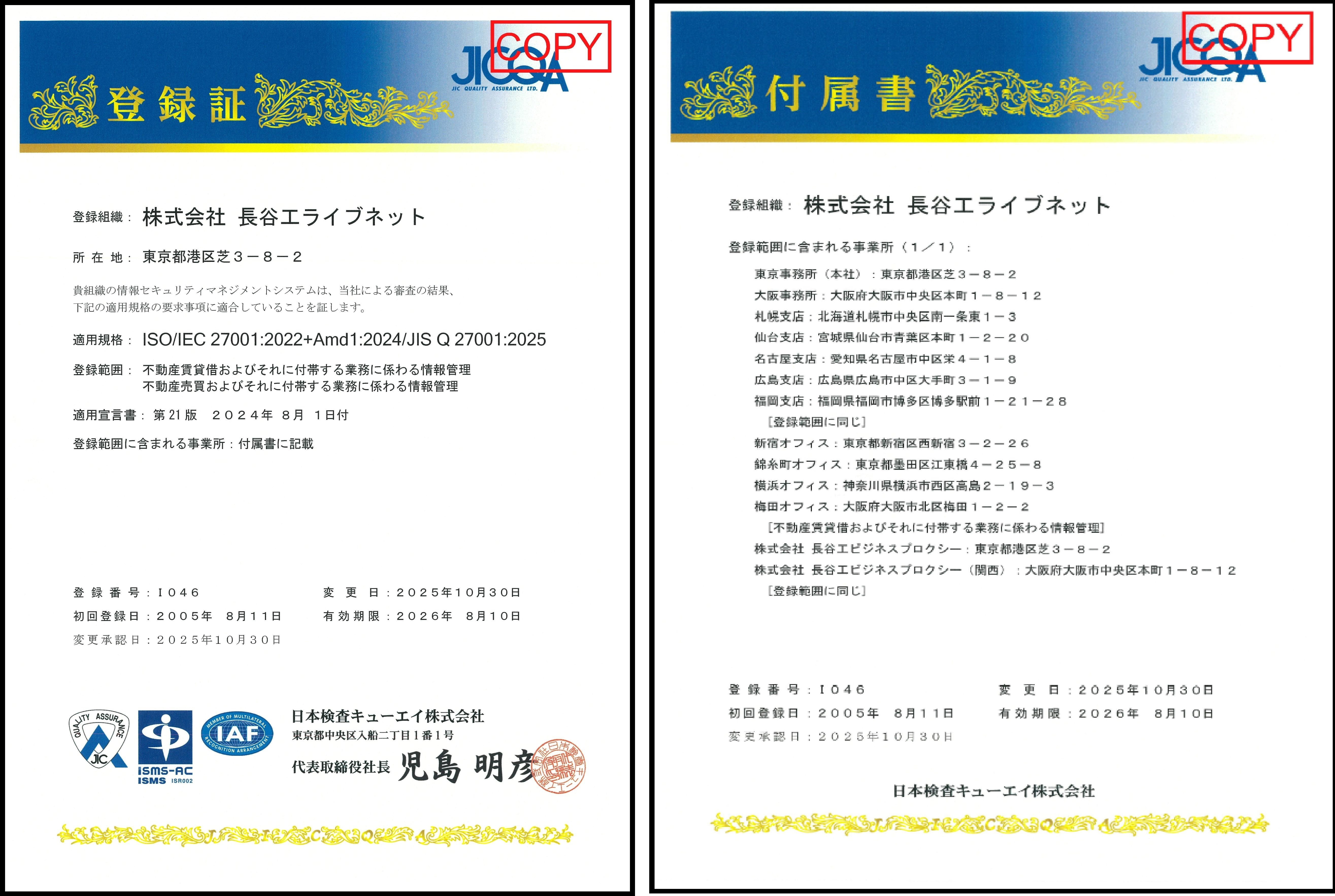 | 登録企業および事業所 | (株)長谷工ライブネット 東京事務所(本社)、大阪事務所、札幌支店、仙台支店、名古屋支店、広島支店、福岡支店 【登録範囲に同じ】 新宿オフィス、錦糸町オフィス、横浜オフィス、梅田オフィス 【不動産賃貸借およびそれに付帯する業務に係わる情報管理】 (株)長谷工ビジネスプロクシー、(株)長谷工ビジネスプロクシー関西 【登録範囲に同じ】 |